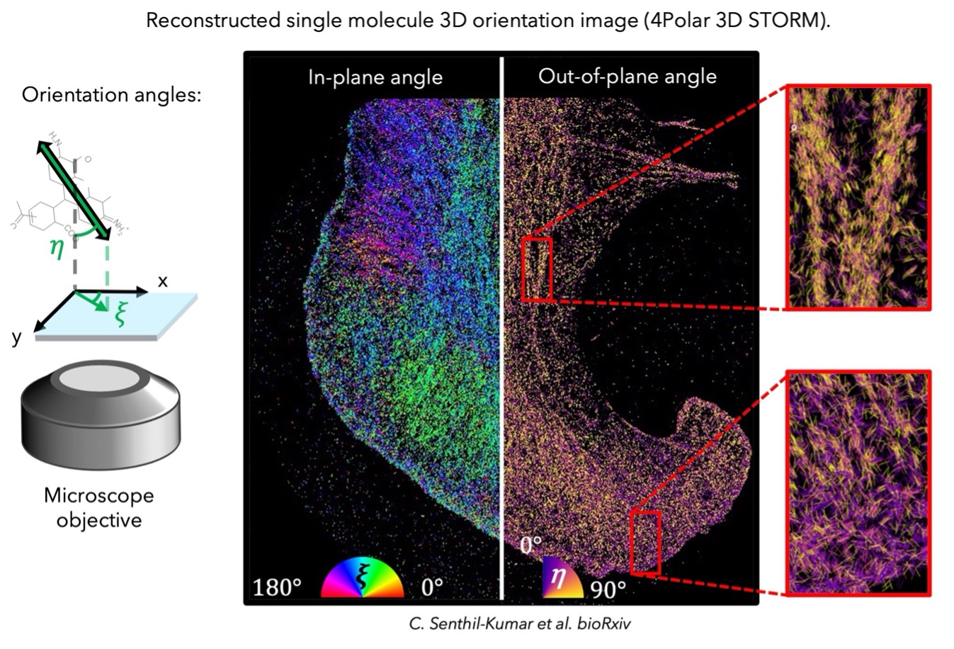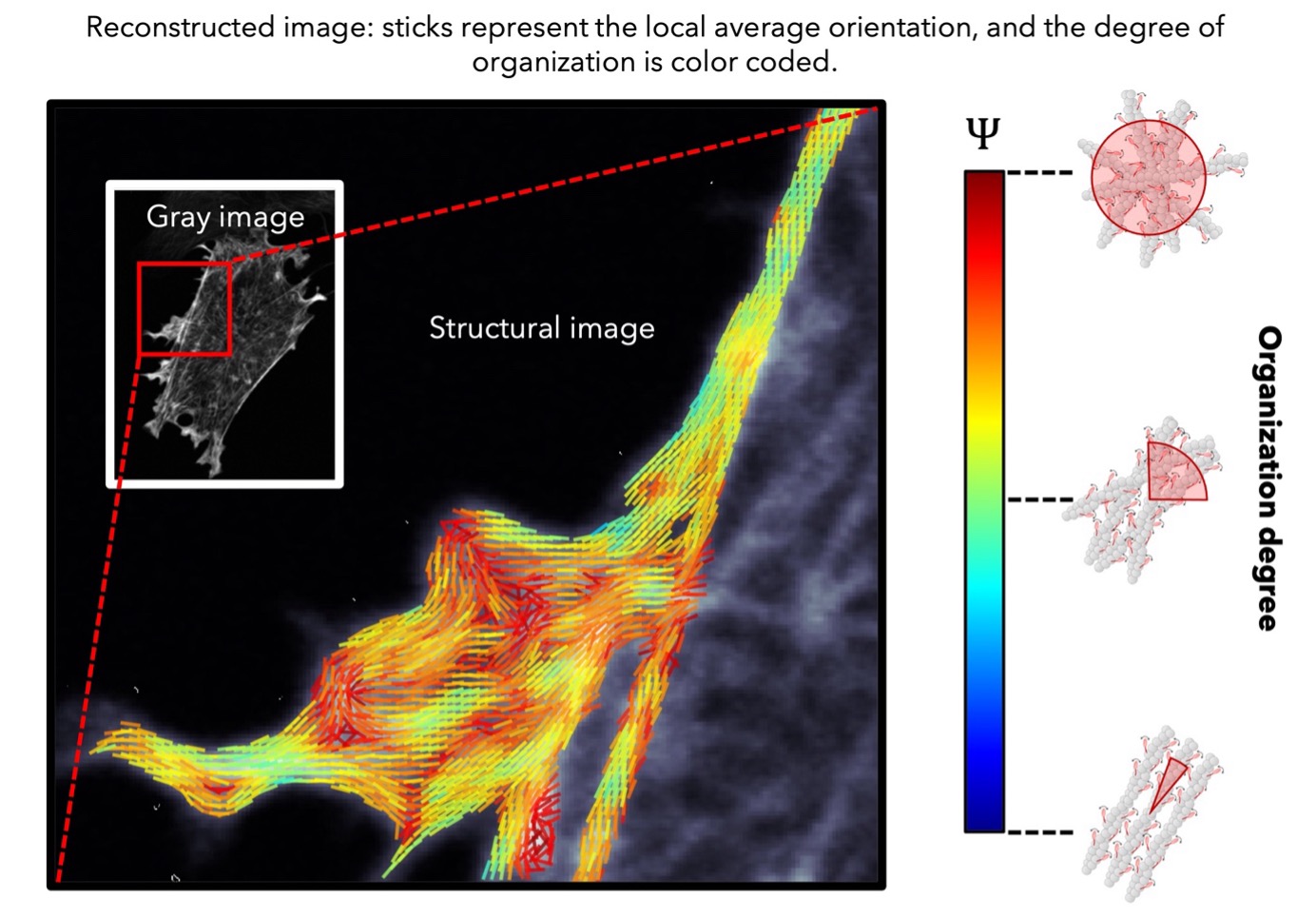Although these techniques are not compatible with single molecule measurements, they are the most commonly used for bio-molecular assemblies. These techniques exploit the fact that fluorescence is maximized when the polarization state of the excitation laser matches the orientation of molecules. For each pixel of an image, we probe the 2D orientation (projection onto the sample plane) and degree of organization of fluorophores attached to proteins of interest. This approach has been successfully applied to studying the organization of cell membrane lipids and actin filaments, and it can be extended to examine orientational changes in membrane proteins, for example. Additionally, probing molecular organization has great potential for visualizing cytoskeletal filament reorganization, such as during morphogenetic events, in real time at the molecular scale. This can help elucidate how these structures contribute to the mechanical properties of cells and tissues, and reveal the roles of associated regulatory proteins. A major part of this work is currently carried out in collaboration with Manos Mavrakis (MOSAIC team), who studies cytoskeletal proteins such as actin and septin. Lastly, the freely shareable (open source) data analysis software, PyPOLAR, has been co-developed with the Mathematics Institute of Marseille (I2M).