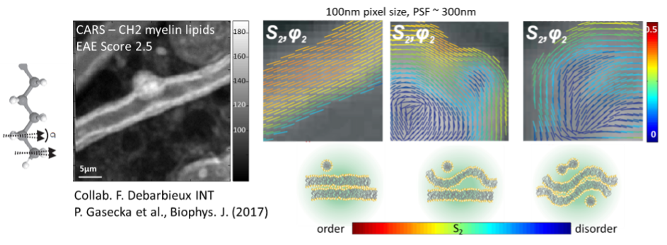 Due to the nonlinear vectorial coupling between incident light polarizations and molecular bonds / molecular induced dipoles directions, tunable incident polarizations lead to a modulation of nonlinear label-free signals (Second Harmonic Generation : SHG, Coherent Anti Stokes Raman Scattering : CARS, Stimulated Raman Scattering : SRS) that can be directly related to the orientational order of biological molecules, without the need of a fluorescent label. We have applied polarized nonlinear microscopy to quantitatively retrieve organizational order in collagen in tissues (by polarized SHG) and lipid structures (by polarized CARS). This methodology is highly sensitive to lipid phases but also to sub-diffraction scale morphological changes in cell membranes. Polarization resolved CARS (pCARS) is now used to image the effect of neurodegenerative diseases on fine myelin structure changes, in mice spinal cord tissues. We are currently developing schemes that allow polarized nonlinear imaging to reach fast imaging rates, either by fast polarization tuning, or via the use of projection on circular polarization combinations. We are also studying the possibilities to develop optical schemes capable to measure the orientation of molecular distributions in 3D, an information which is important in complex tissues. All together these approaches should permit to better quantify molecular order in live and in 3D in tissues related to the study of diseases such as neurodegenerative diseases or cancer.