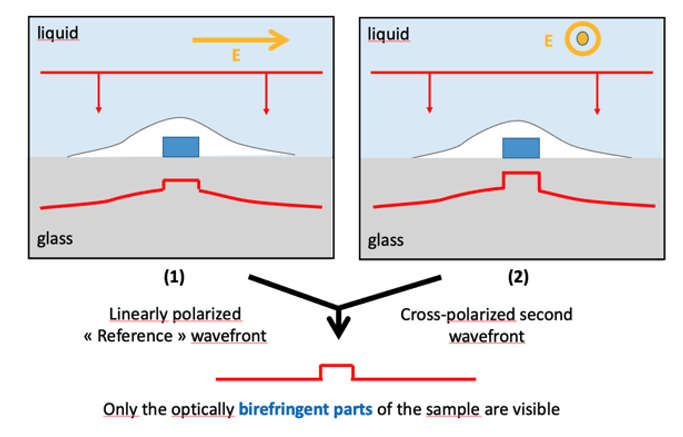 As explained before, to obtain a map of the OPD for a given sample, we successively measure two wavefronts in unpolarized light, namely a first one outside the sample (reference wavefront) and a second one with sample. A possible variation of the technique consists of using a linearly polarized incident light beam and measure a first wavefront with polarization along a defined axis, then a second with crossed polarization, perpendicular to the first one. Consequently, if the observed sample is optically isotropic, the two wavefronts will be identical. On the other hand, if some area in the sample (blue area on the figure) is optically birefringent, then the refractive index, and thus the retardance, seen by the light field, will be different for the two polarization states under consideration. A comparison between these two wavefronts then allows us to specifically identify any birefringent structure (within the observation plane) of the sample.